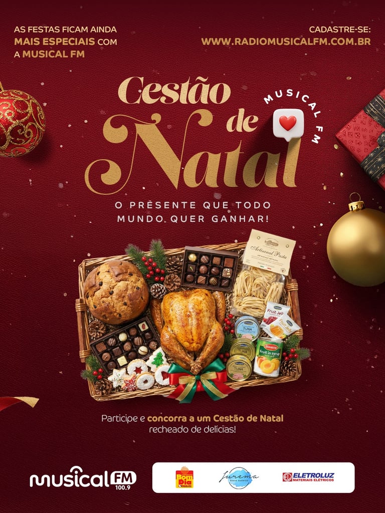 A Musical está sorteando vários cestões recheados com ave natalina, atum, gelatina, panetone, biscoitos, pêssego, goiabada, barra de chocolate e muito mais! 😍