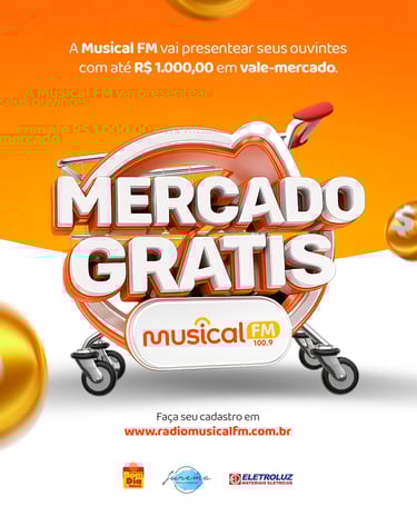 Quer ganhar um vale-compras de R$250,00 e fazer parte de um desafio emocionante? Participe da Promoção Mercado Grátis e venha jogar no estúdio da rádio!